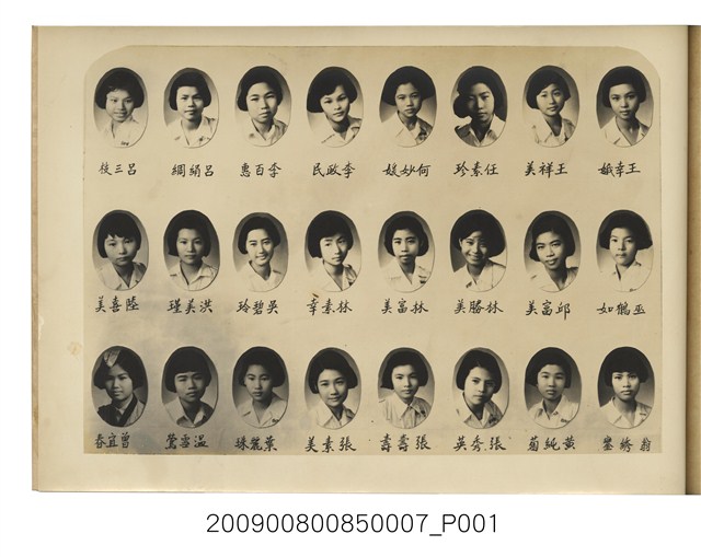 1.本文物為王幸娥等學生之大頭照。本頁紙張泛黃,內含有24位女學生的大頭照。當時代女學生的髮型皆是約略到耳際長度的短直髮。為2009.008.0085畢業同學錄編輯委員會編《台中家職學校同學錄》內頁之一。2.臺中家職創校於昭和10年(1935),初名為「臺中家政女學校」,昭和19年(1944)更名「臺中商業實踐女學校」。戰後經過多次改制,曾更名為「臺中市立家事職業學校」、「臺中市立高級家事職業學校」、「國立臺中高級家事商業職業學校」等,現今稱為「臺中市立臺中家事商業高級中等學校」。