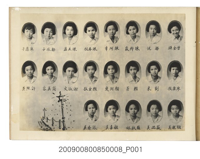 1.本文物為曾金瑛等學生之大頭照。本頁紙張泛黃,內含有21位女學生的大頭照,空白處繪製插畫填補。當時代女學生的髮型皆是約略到耳際長度的短直髮。為2009.008.0085畢業同學錄編輯委員會編《台中家職學校同學錄》內頁之一。2.臺中家職創校於昭和10年(1935),初名為「臺中家政女學校」,昭和19年(1944)更名「臺中商業實踐女學校」。戰後經過多次改制,曾更名為「臺中市立家事職業學校」、「臺中市立高級家事職業學校」、「國立臺中高級家事商業職業學校」等,現今稱為「臺中市立臺中家事商業高級中等學校」。