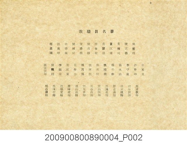 本件為臺北市立大同中學全體教職員合照,收於民國39年(1950)7月《臺北市立大同中學初中部第5屆畢業紀念冊》內。照片中教職員共計39人。