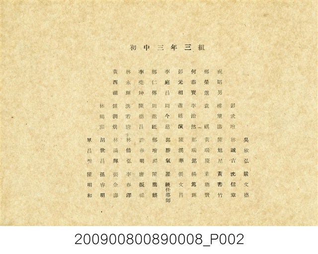 本件為臺北市立大同中學初中部第5屆三年三班畢業班級團體照,收於民國39年(1950)7月《臺北市立大同中學初中部第5屆畢業紀念冊》內。照片中學生共計45人,前排正中央為級任導師羅時雍。
