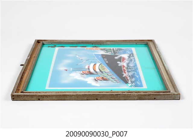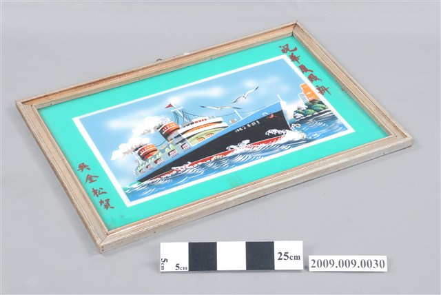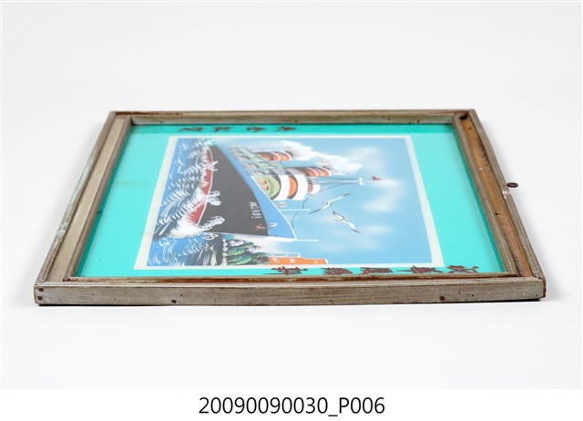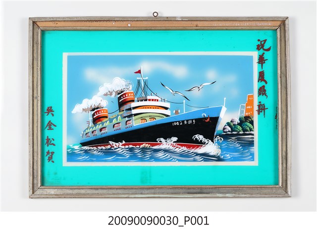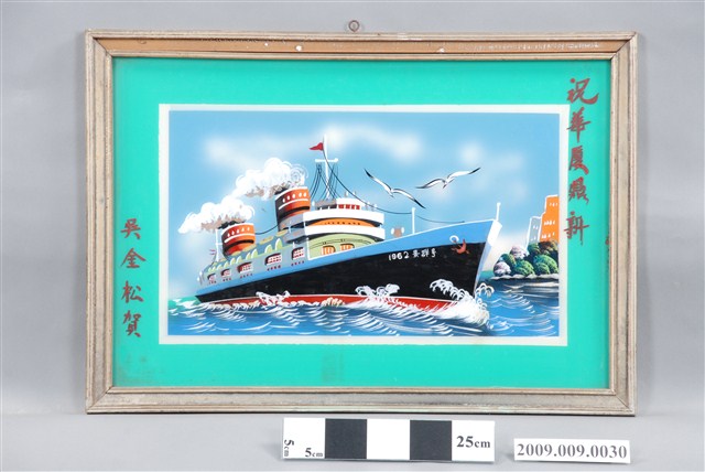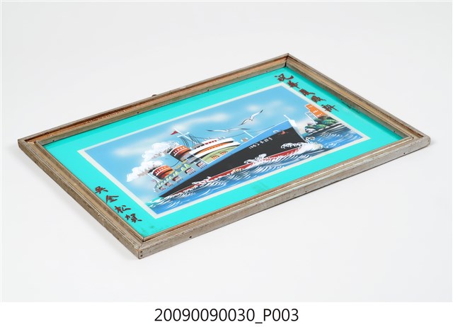 1.本藏品為帶框玻璃畫一幅,繪畫主題為輪船,整體為水平佈局,下部為藍白波光的水面,上部則為蔚藍的天空,船體由左向右斜陳畫面中央,船首朝右,船身下為紅色水線,主體為黑色,上端與船樓則以白色為主。船樓上有兩個冒著白煙的煙囪,煙囪前後各有一桅杆,前方桅杆上掛一三角紅旗,船首以白字寫有1962○○号(字跡不明)。船首上方繪有兩隻翻飛的海鷗,右端則畫有水岸樹木與簡化的樓房。