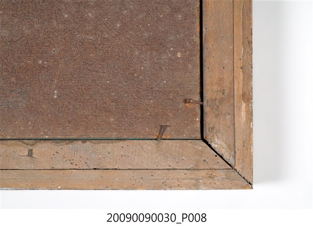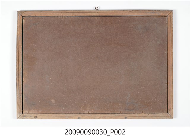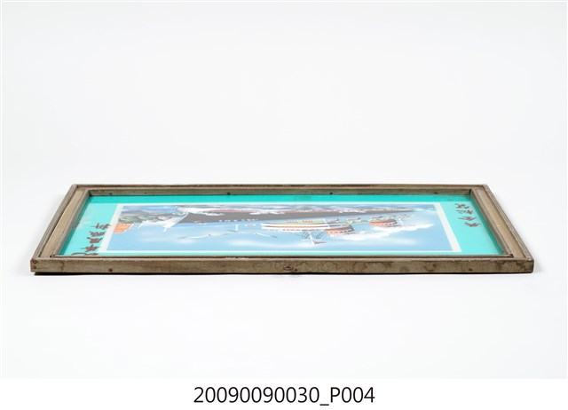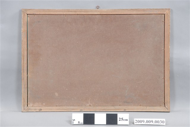 4.本件作品為玻璃畫,是以透明平板玻璃做為畫布,以畫筆沾上顏料在玻璃背面作畫,利用玻璃保護內部的畫面。日治時期,玻璃畫受到臺灣民間社會歡迎,成為流行的工藝品,常作為喜慶餽贈之用,在紅眠床、梳妝檯、櫥櫃、匾額等都可以見到其應用。