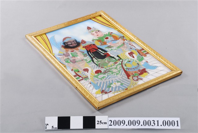 玻璃畫是將畫稿人之底稿置於玻璃下,畫師在玻璃上描好圖案後,在玻璃後進行反畫。本件為關聖帝君玻璃畫,畫像裱框。關公坐姿閱讀《春秋》,關平、周倉隨伺在後。關平捧印,周倉持關刀,這是民間頗為流行的關公相關聖像組合之一。關聖帝君為佛教、道教、儒教尊奉的神明,是華人世界相當普遍的神祇,亦是臺灣漢人神明廳常見的神明圖像。