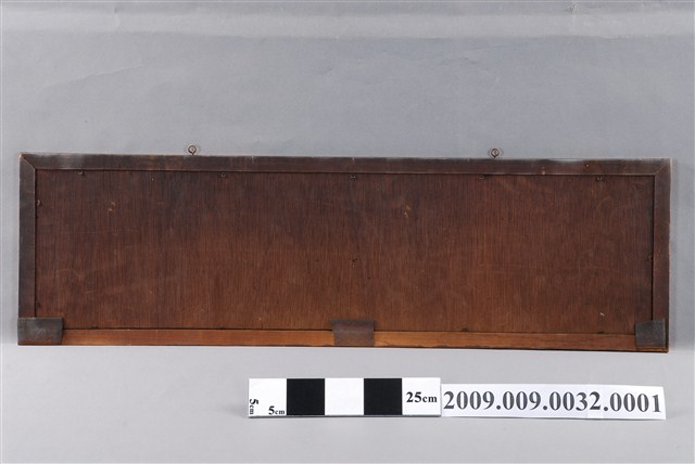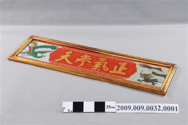 玻璃畫是將畫稿人之底稿置於玻璃下,畫師在玻璃上描好圖案後,在玻璃後進行反畫。本件為關聖帝君玻璃畫組中的橫聯,以龍鳳圖拱正氣參天四字。