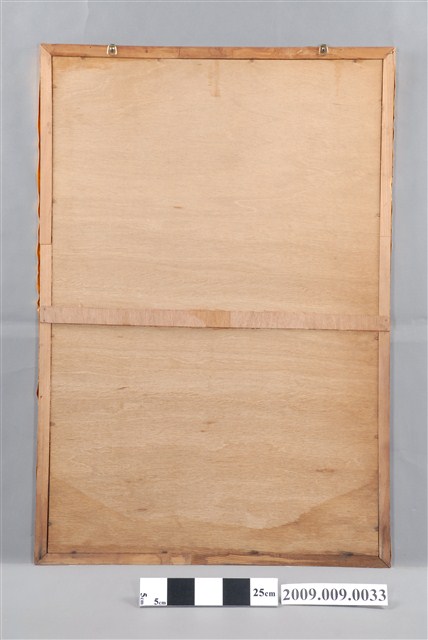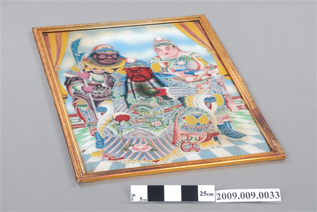 本件為關聖帝君玻璃畫神明彩,關公坐姿拂鬚,關平、周倉隨伺在後。畫像裱框。關聖帝君為佛教、道教、儒教尊奉的神明,是華人世界相當普遍的神祇,亦是臺灣漢人神明廳常見的神明圖像。玻璃畫是將畫稿人之底稿置於玻璃下,畫師在玻璃上描好圖案後,在玻璃後進行反畫。