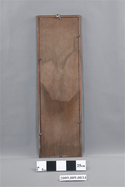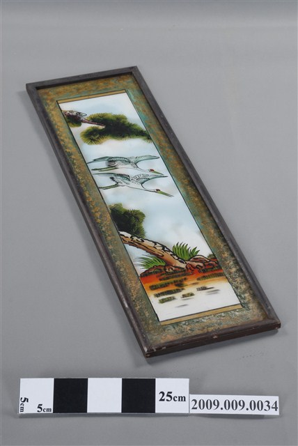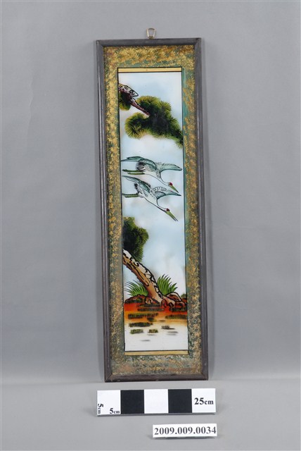 1.本件玻璃畫係以黑色畫框與玻璃畫組合而成,豎幅形式,畫中為一對丹頂鶴在松樹旁飛翔。松樹耐嚴寒,長青不朽,被視爲百木之長,是長壽的象徵;鶴則被視爲出世、高潔的象徵。因此,兩者經常被組合用來作為祝壽考、喻長生的吉祥圖畫,在民間流傳相當廣泛。2.玻璃畫是以顏料在玻璃的背面作晝,畫法可採國畫、油畫、水粉畫等多種繪畫技法,表現山川風光、民俗故事、佛名聖事、名勝古跡、鳥獸魚蟲、奇花異草等內容,1950及60年代在臺灣常用來祝賀婚慶、入厝、祝壽及開幕誌喜等。
