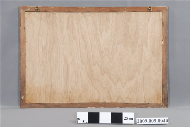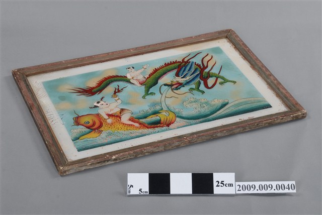 1.本件玻璃畫係以木質畫框與玻璃畫組合而成。畫中兩個孩童分別騎著一隻巨龍及一隻金紅色鯉魚,在波濤洶湧的海浪中追逐嬉戲。中國神話傳說中,鯉魚為龍的化身,鯉魚逆流躍龍門,化作巨龍騁天地,龍魚互化的文化意象,讓鯉魚自古即在中華文化中佔居重要地位,有金榜題名、吉慶高升、飛黃騰達,充滿吉祥富貴之寓意。2.玻璃畫是以顏料在玻璃的背面作晝,畫法可採國畫、油畫、水粉畫等多種繪畫技法,表現山川風光、民俗故事、佛名聖事、名勝古跡、鳥獸魚蟲、奇花異草等內容,1950及60年代在臺灣常用來祝賀婚慶、入厝、祝壽及開幕誌喜等。