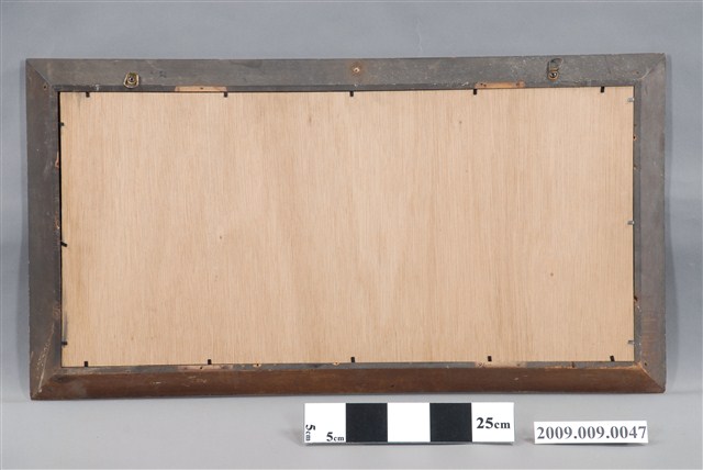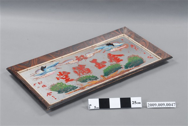1.本件為橫方,中間寫金玉滿堂,上方有雙鶴中夾一祝字,下方則有長青松柏。2.玻璃畫是將畫稿人之底稿置於玻璃下,畫師在玻璃上描好圖案後,在玻璃後進行反畫。