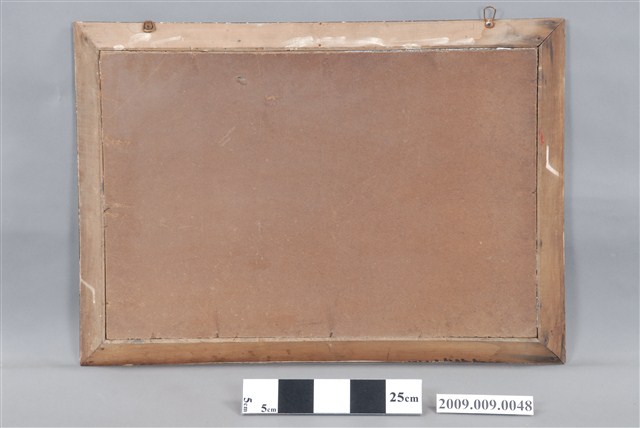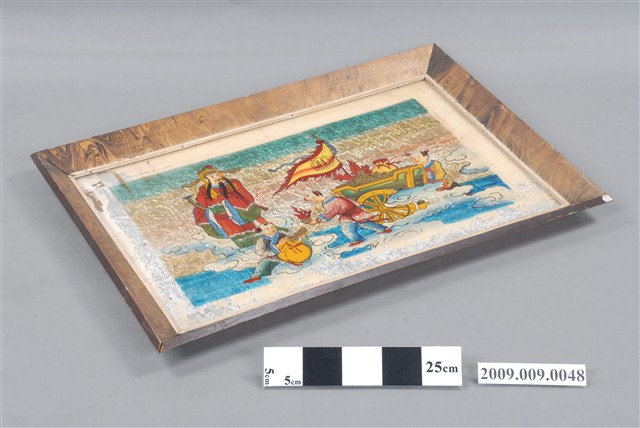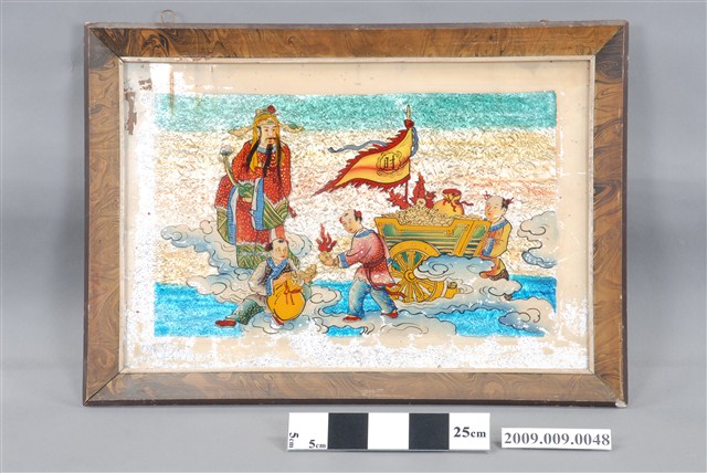 本件為財神玻璃畫神明彩,財神微笑命令童子將缸內的元寶往下倒,象徵賜財。整體裱框。求財為一般民眾所熱烈期盼,財神畫像為人們所歡迎的神明彩之一種。玻璃畫是將畫稿人之底稿置於玻璃下,畫師在玻璃上描好圖案後,在玻璃後進行反畫。