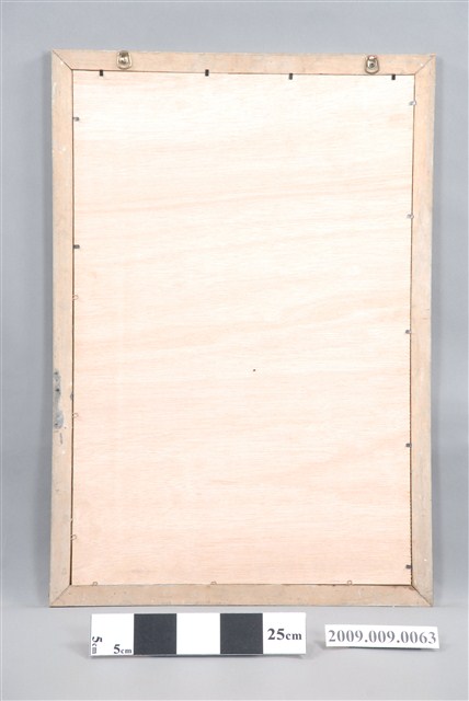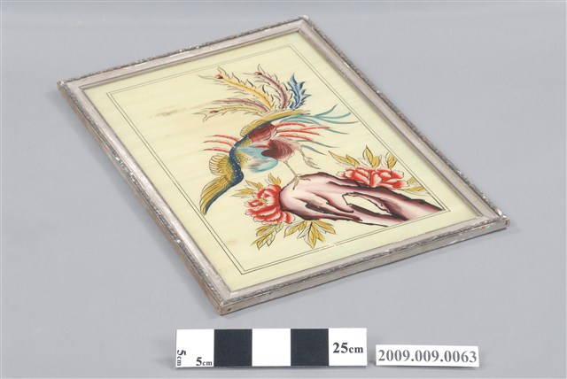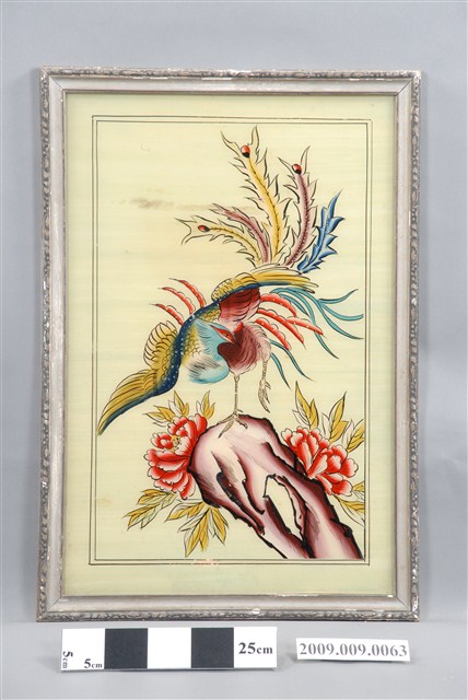 1.本件玻璃畫係以銀色畫框與玻璃畫組合而成,畫面貼上銀箔作為背景底色,畫中主角鳳凰立於石上,兩側並繪有2株牡丹花。鳳凰及牡丹傳統認為其為鳥中之王及花中之王,有富貴之意,牡丹與石頭之組合也常用於富貴紋,本作帶有長命富貴之寓意。2.玻璃畫是以顏料在玻璃的背面作晝,畫法可採國畫、油畫、水粉畫等多種繪畫技法,表現山川風光、民俗故事、佛名聖事、名勝古跡、鳥獸魚蟲、奇花異草等內容,1950及60年代在臺灣常用來祝賀婚慶、入厝、祝壽及開幕誌喜等。
