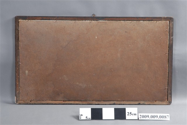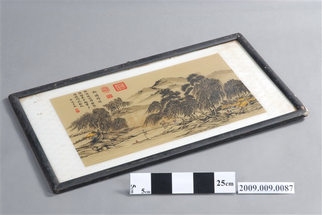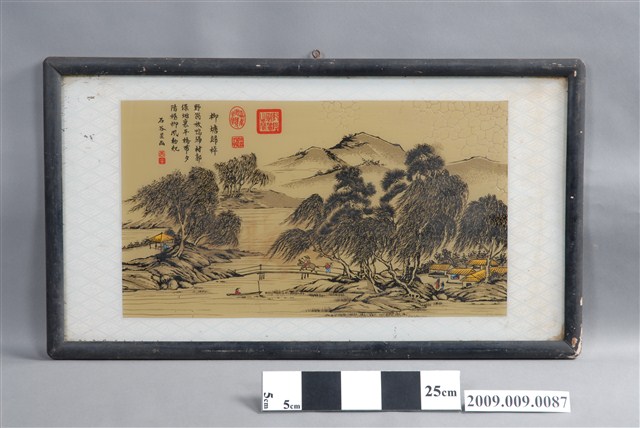 1.本件玻璃畫係以木質畫框與玻璃畫組合而成,為傳統墨色山水畫,本畫主題為迎風飄逸的柳樹水塘旁,民間生活之描繪,包括釣魚、乘船、乘馬等。畫面左上方題名「柳塘歸棹」,並書寫上詩詞與紅色印章落款。2. 臺灣玻璃畫通常由畫師在玻璃按母稿描好圖案後,在玻璃背面進行反畫,一般順序為先描黑邊,然後圈金,接著再上紅白色,最後才著其它顏色,等全乾後噴底漆,如果要做成鏡面,必須先上透明膠後再鋪水銀。畫法可採國畫、油畫、水粉畫等多種繪畫技法,表現山川風光、民俗故事、佛名聖事、名勝古跡、鳥獸魚蟲、奇花異草等內容,1950及60年代在臺灣常用來祝賀婚慶、入厝、祝壽及開幕誌喜等。