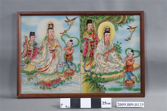 本件為雙幅觀音玻璃畫神明彩,雙幅觀音均由觀音、善財和龍女,一隻啣著念珠的白鸚鵡,四者組織而成。左幅為持經觀音形像、右幅為楊柳觀音形像。整體表框。神明圖畫最早由手工繪畫、玻璃手工繪畫、玻璃印刷製作,因應時代而轉變。玻璃畫是將畫稿人之底稿置於玻璃下,畫師在玻璃上描好圖案後,在玻璃後進行反畫。
