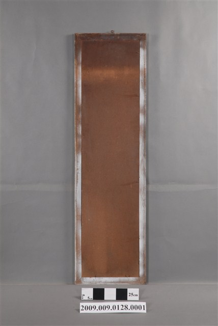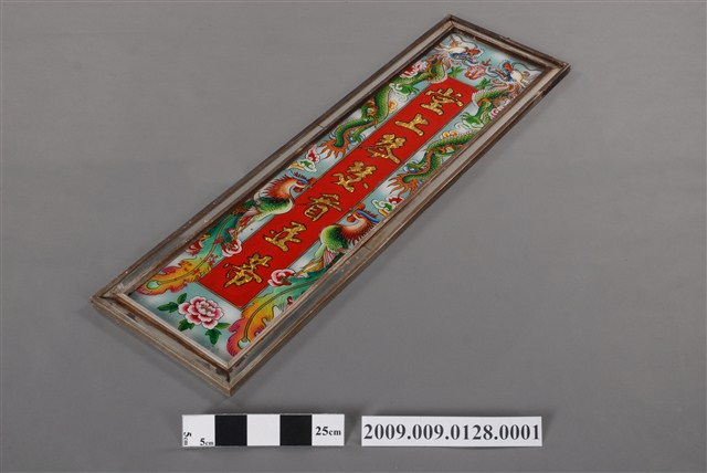 本件為新婚誌喜玻璃畫之上聯,上聯題字「堂上琴瑟看並蒂」。係祝福新人結婚之賀聯,對聯裱框。玻璃畫是將畫稿人之底稿置於玻璃下,畫師在玻璃上描好圖案後,在玻璃後進行反畫。