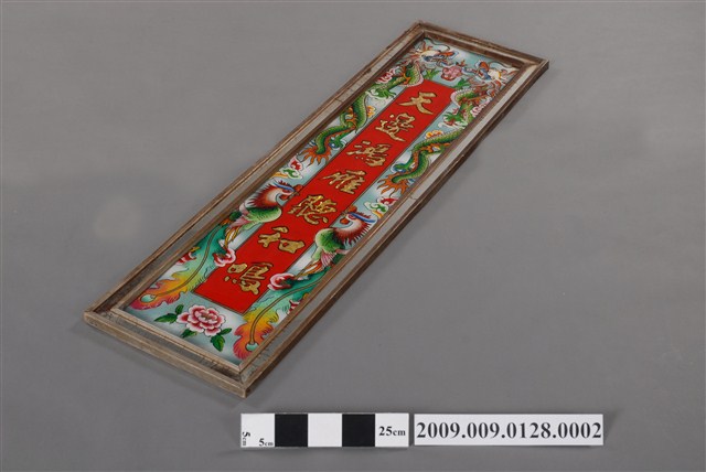 本件為新婚誌喜玻璃畫之下聯,下聯題字:「天邊鴻雁聽和鳴」。係祝福新人結婚之賀聯,對聯裱框。玻璃畫是將畫稿人之底稿置於玻璃下,畫師在玻璃上描好圖案後,在玻璃後進行反畫。