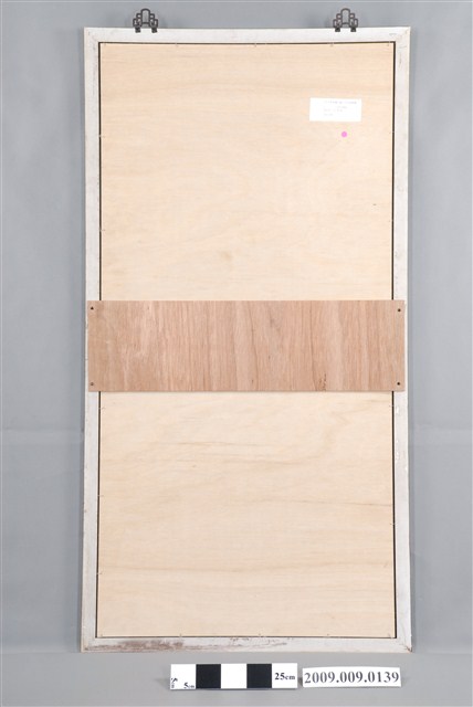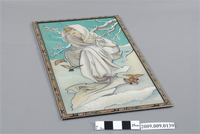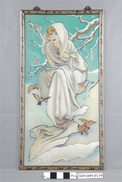 1.本件玻璃畫係以銀色金屬螺鈿鑲嵌畫框與玻璃畫組合而成,畫作迎合民眾對西洋繪畫的喜愛,仿照新藝術派知名作品幕夏的四季畫作,畫出四幅唯美女性,代表春夏秋冬四季,本畫作描繪一穿著白色斗篷的金髮美女身處銀白雪地,身後有代表冬天的梅樹,腳邊有幾隻麻雀陪伴,來描繪冬季。2.本件玻璃畫主要以歐式彩繪『玻璃-上彩』法製畫,首先使用勾邊膠筆勾勒愛圖案框架,再以刮刀沾「水晶玻璃膠」填色,並營造表面立體不規則的效果。3.玻璃畫之畫法可採國畫、油畫、水粉畫等多種繪畫技法,表現題材多樣,1950及60年代在臺灣常用來祝賀婚慶、入厝、祝壽及開幕誌喜等。