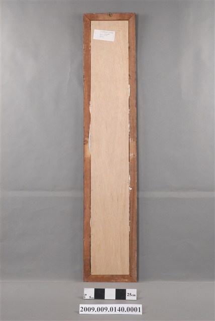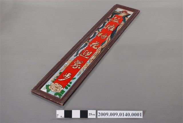 本件為新婚誌喜玻璃畫對聯之上聯,題字「笑擁梅花迎翠步」。此係祝福新人結婚之賀聯,對聯裱框。玻璃畫是將畫稿人之底稿置於玻璃下,畫師在玻璃上描好圖案後,在玻璃後進行反畫。