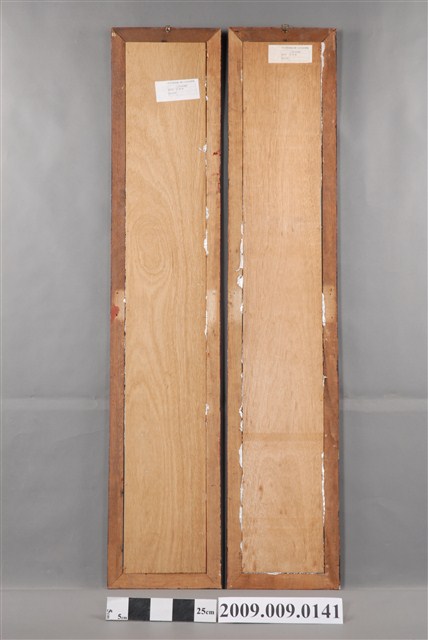 本件為玻璃畫神明彩之對聯,對聯的背景為龍燭,上聯「紫竹林中觀自在」、下聯「白蓮臺上見如來」,上、下聯均表框。玻璃畫是將畫稿人之底稿置於玻璃下,畫師在玻璃上描好圖案後,在玻璃後進行反畫。