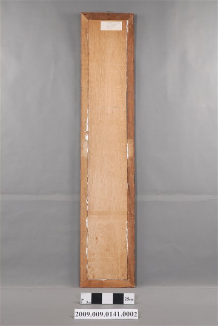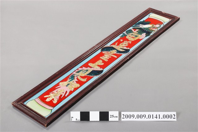 本件為玻璃畫神明彩之下聯,對聯的背景為龍燭,下聯「白蓮臺上見如來」,整體裱框。玻璃畫是將畫稿人之底稿置於玻璃下,畫師在玻璃上描好圖案後,在玻璃後進行反畫。
