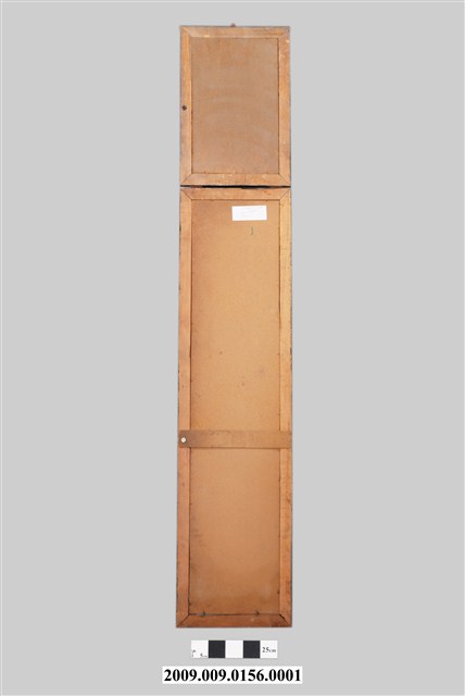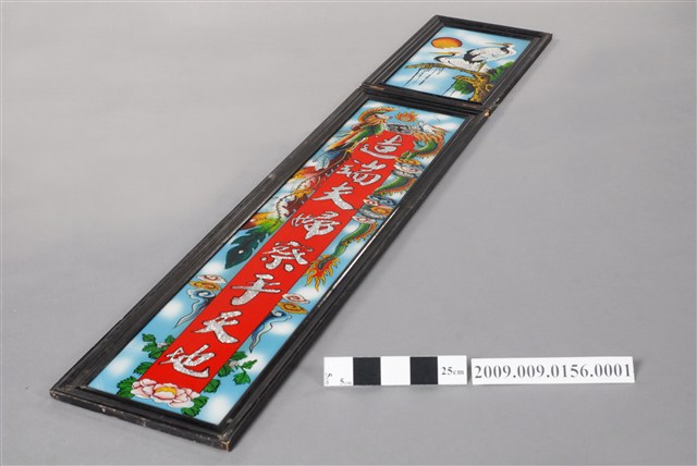 此為玻璃畫製法的聯對,上聯是造瑞夫婦察乎天地。玻璃畫是將畫稿人之底稿置於玻璃下,畫師在玻璃上描好圖案後,在玻璃後進行反畫。