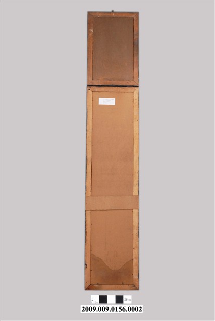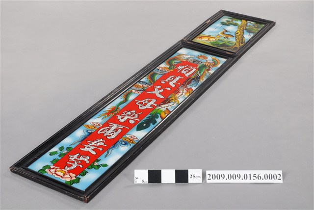 此為玻璃畫製法的聯對,下聯是順其父母樂爾妻孥。玻璃畫是將畫稿人之底稿置於玻璃下,畫師在玻璃上描好圖案後,在玻璃後進行反畫。