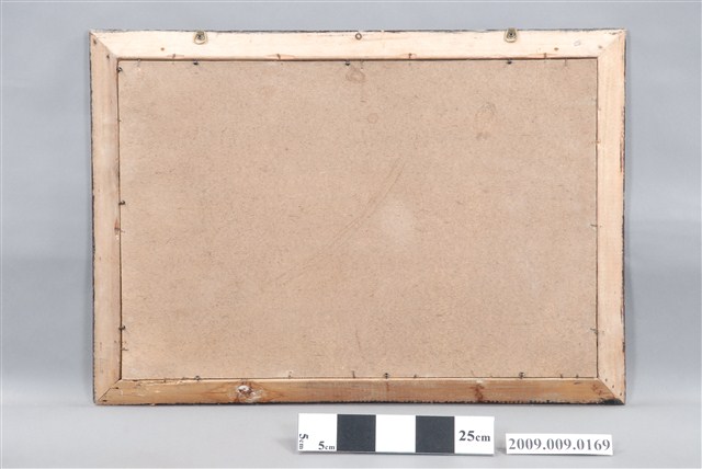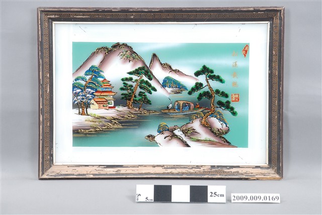 1.本件松溪載鶴玻璃畫為臺南赤崁樓附近所販賣之紀念品,長方形橫幅,裱深褐色金回紋木框成為畫幅,上方釘有二個掛勾,可掛於牆上做為裝飾。畫面四周以白色作一寬邊框,畫作主題為山水風景圖,採中式山水畫法描繪山水、松樹、瓦房,水面上有一艘小舟,舟上乘坐一名男子、一名船夫與一隻白鶴,畫面左上方紅色描金的臺灣圖像中寫有「赤崁」二字,並以金漆寫上「松溪載鶴」,下方有「麗生画室」之方形落款。2.玻璃畫又稱為玻璃彩繪,屬於民間的平面藝術,使用毛筆沾油漆在平板玻璃背面作畫。臺灣的玻璃彩繪約始於日治時期,光復後受到工業化量產的影響開始流行於一般階層,約於民國40、50年代達到鼎盛時期。玻璃畫的題材多帶有吉祥意味,常用來作為祝壽、婚慶、新居落成、商店開張等誌喜之賀禮。