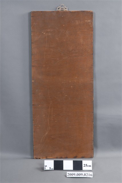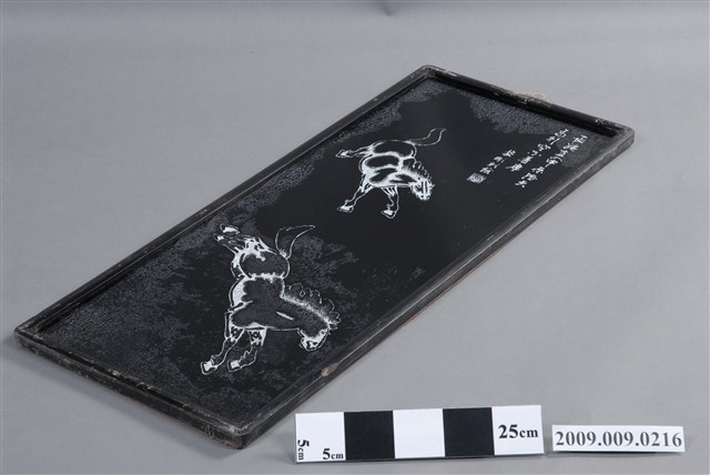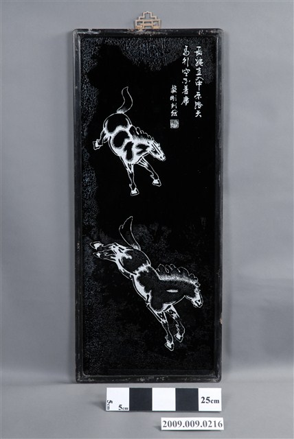 1.本件奔馬玻璃畫為長直幅,裱黑色木框成為畫幅,木框中央釘有一個掛勾,可掛於牆上做為裝飾。畫作為黑色為底,表面可見玻璃裂紋,以白漆繪圖與題字,採中式水墨畫法描繪二匹奔馳中的駿馬,右上方題詩:「長韁直入中原路天馬行空不着塵」,並有「毅剛刻繪」之創作者署名與方形落款。2.玻璃畫又稱為玻璃彩繪,屬於民間的平面藝術,使用毛筆沾油漆在平版玻璃背面作畫。臺灣的玻璃彩繪約始於日治時期,光復後受到工業化量產的影響開始流行於一般階層,約於民國40、50年代達到鼎盛時期。玻璃畫的題材多帶有吉祥意味,常用來作為祝壽、婚慶、新居落成、商店開張等誌喜之賀禮。
