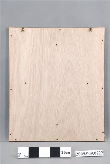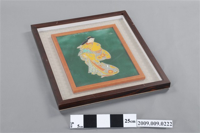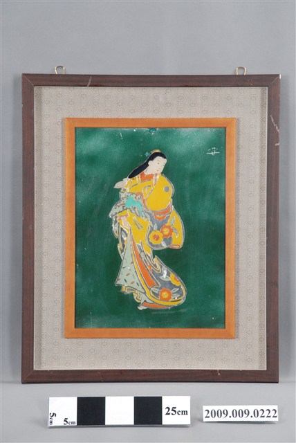 1.本件日本美女玻璃畫為長方形直幅,裱橘色木框外加襯布與深褐色木框成為畫幅,木框上方釘有二個掛勾,可掛於牆上做為裝飾。畫作主題為日本仕女,以綠色為底,描繪一名身著橘黃色和服之長髮仕女,呈側身單腳站立姿態,右上角有一些許白色斑點與線條,狀似「女」字,但無法判定是否為題字。2.玻璃畫又稱為玻璃彩繪,屬於民間的平面藝術,使用毛筆沾油漆在平版玻璃背面作畫。臺灣的玻璃彩繪約始於日治時期,光復後受到工業化量產的影響開始流行於一般階層,約於民國40、50年代達到鼎盛時期。玻璃畫的題材多帶有吉祥意味,常用來作為祝壽、婚慶、新居落成、商店開張等誌喜之賀禮。
