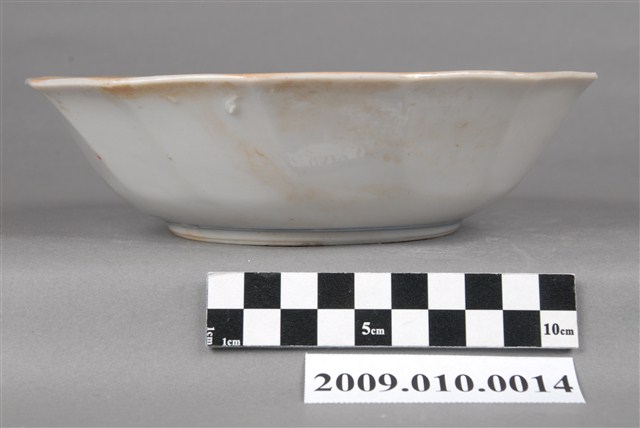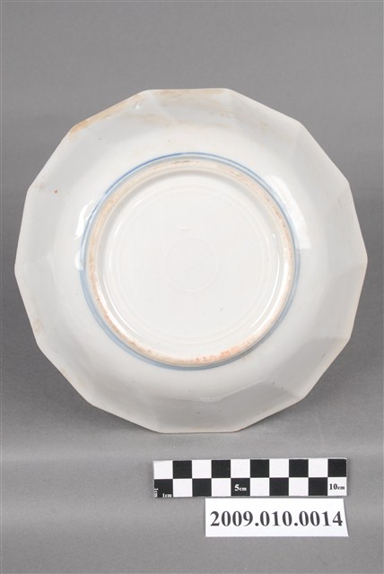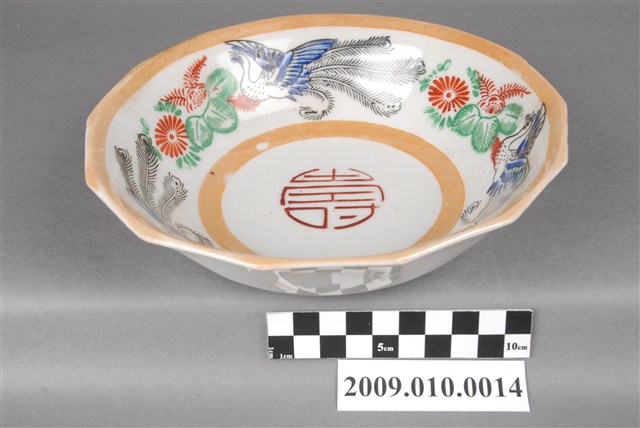 1.本件為彩繪印花鳳紋碗,器形呈十二邊形,撇口,弧壁,淺圈足。碗外壁呈素白,碗內紋飾主要以印花法搭配彩繪來表現,口沿及碗底以毛筆分別繪製一圈黃色閃光釉裝飾,碗內壁則等距蓋印上四隻鳳鳥的輪廓,並用毛筆於鳥冠及鳥羽處填上藍色。四隻鳳鳥之間,則蓋上有日本南島風情的菊花及及扶桑花葉圖紋做裝飾,碗底中央蓋印上「壽」字。閃光釉為釉上彩的一種,1960年代盛行,以低溫釉上金彩,釉面金光閃閃,但易褪色、保存不易,多在鶯歌地區製作,1980年代後少見。2.清代至日治時期臺灣碗盤陶瓷器主要由日本及中國大陸進口,直到1930年代後在日政府的鼓勵下,生產碗盤的窯廠在南投、北投、鶯歌、魚池等地陸續出現。1950-1960年代,碗盤生產集中在北投和鶯歌,1969年北投陶瓷廠關閉,許多窯場逐漸轉移到鶯歌地區。使鶯歌逐漸發展成為臺灣陶瓷重鎮。