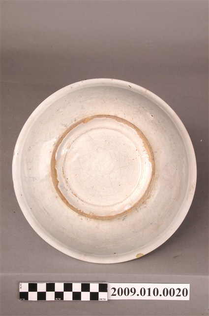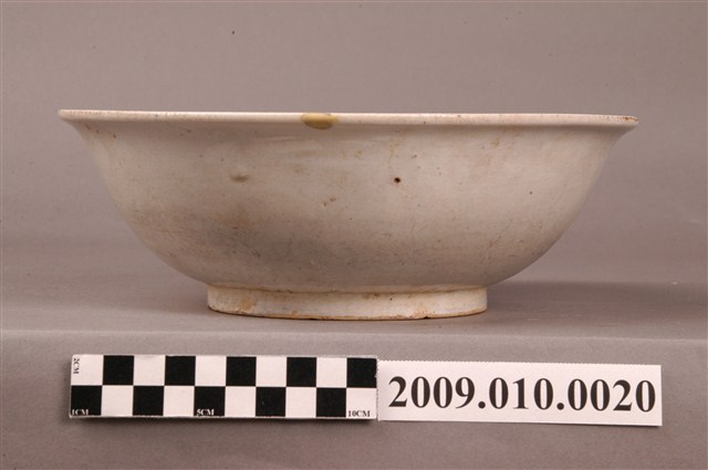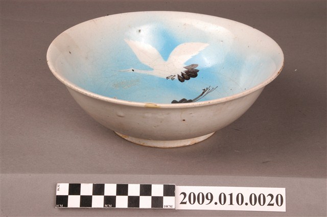 1.本件為藍彩噴釉雙鶴紋碗公,器形平沿敞口,淺弧壁,圈足。有施釉,碗內外壁皆有顆粒、氣泡、黑點以及開片現象,外壁呈素白色,碗內壁使用淺藍噴釉留白的方式呈現兩隻在藍天中飛翔的白鶴,並以黑色顏料勾繪出白鶴的眼睛、尖喙、尾羽及雙腳,兩隻白鶴分別有不同的姿態,畫面十分生動。鶴在東亞有長壽的象徵,表達吉祥之意,為常見的碗盤紋飾之一。2.清及日治時期臺灣碗盤陶瓷器主要由日本及中國大陸進口,直到1930年代後在日政府的鼓勵下,生產碗盤的窯廠在南投、北投、鶯歌、魚池等地陸續出現。從1950-1960年代,碗盤生產集中在