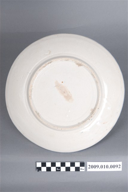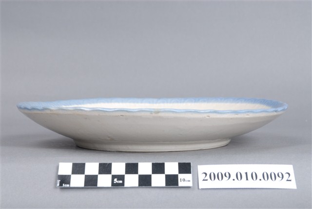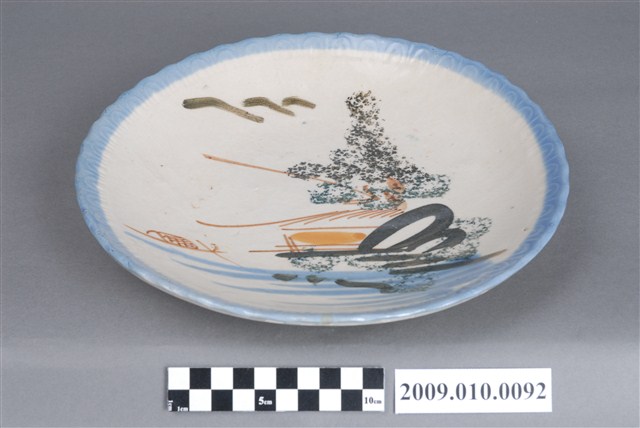 1.這件彩繪山水紋花口盤,是北投地區生產的日用器皿。花口外侈,弧壁下斂,圈足,口沿壓印蓮瓣紋,並塗一圈青花釉裝飾。全器施釉,釉色呈乳白色,表面稍有顆粒、氣泡。盤面繪山水紋,以褐釉繪屋舍、小船與樹枝,再以綠釉繪樹葉及草叢、黑釉繪岩群、淺青色釉繪水面,繪製筆法流暢,筆觸明顯。此件花口盤為戰後初期製作,但圖案裝飾仍帶有日本陶畫風格,可見日治時代窯業發展的影響。2.日治時代政府支持北投、南投、苗栗等地區的窯業生產,為臺灣陶瓷工業發展奠定了基礎。以北投窯業而言,如大正8年(1919)總督府補助設立「北投窯業株式會社」、昭和5年(1930)在中央研究所輔導下設立「台灣陶器株式會社」,促使臺灣能夠自行生產符合臺灣人飲食習慣的日用器皿。窯廠在二戰後仍持續發展,甚至聘請國外專家來開發、改良產品,直到1960年代後期,政府宣佈北投地區禁止開採陶土及燃燒生煤,北投窯業的地位才被鶯歌取代。
