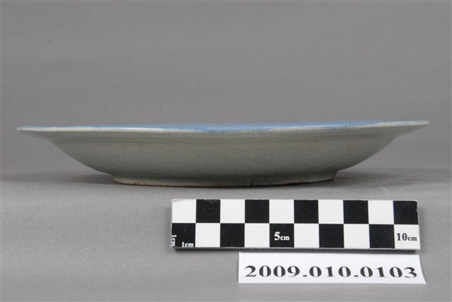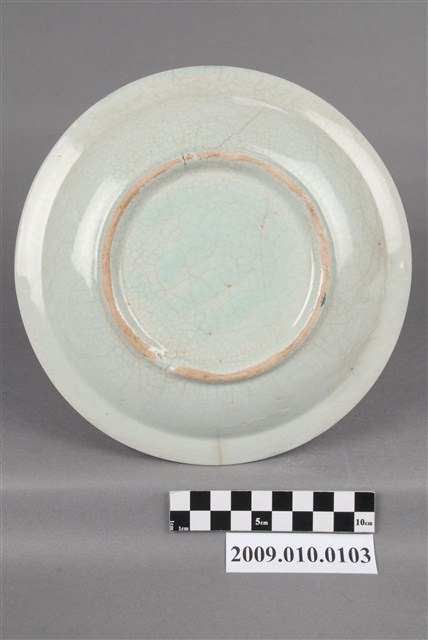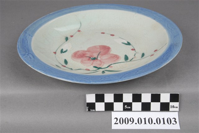 1.這件青花粉紅綠彩花卉紋圓盤,是北投地區產製的日用食具。器形呈折沿口,圓鼓腹,下接圈足。口沿壓印環形紋一圈,上並填青花釉彩裝飾。通體施釉,釉色偏青白色,釉面有光澤,器身可見開片紋路。盤面以粉紅釉及綠釉繪花卉紋,繪製線條婉轉,頗為雅緻。2.臺灣北投、鶯歌等地區自產的花卉紋盤,常見以手繪方式繪花卉紋,並於口沿填繪青花弦紋一圈的裝飾方法。這些花卉紋飾以裝飾為目的,未必指涉具體花卉,因此形態也很多變。值得一提的是,約在日治時代後期至戰後初期,業者引進了氧化鉻作為色料,研發出粉紅色釉並裝飾於花卉紋上,掀起了裝飾上的流行。