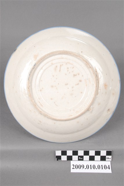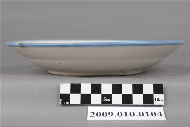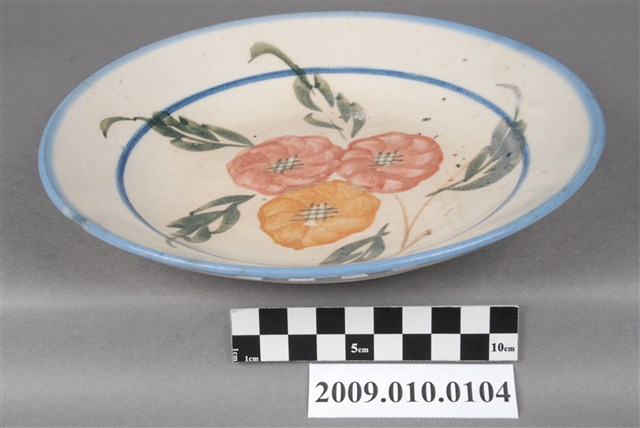 1.這件彩繪花卉紋圓盤,是北投地區產製的日用食具。器形呈折沿口,圓鼓腹,下接圈足。通體施釉,釉色偏乳白色,施釉不均勻,底部有幾處剝釉,並有雜質沈澱。口沿及盤面各飾一圈青花弦紋,盤心則以粉紅釉、橘黃釉及綠釉繪花卉紋。花朵筆觸明顯,花瓣排列整齊,枝葉線條疏展,整體風格頗為秀雅。2.臺灣北投、鶯歌等地區自產的花卉紋盤,常見以手繪方式繪花卉紋,並於口沿填繪青花弦紋一圈的裝飾方法。這些花卉紋飾以裝飾為目的,未必指涉具體花卉,因此形態也很多變。值得一提的是,約在日治時代後期至戰後初期,業者引進了氧化鉻作為色料,研發出粉紅色釉並裝飾於花卉紋上,掀起了裝飾上的流行。