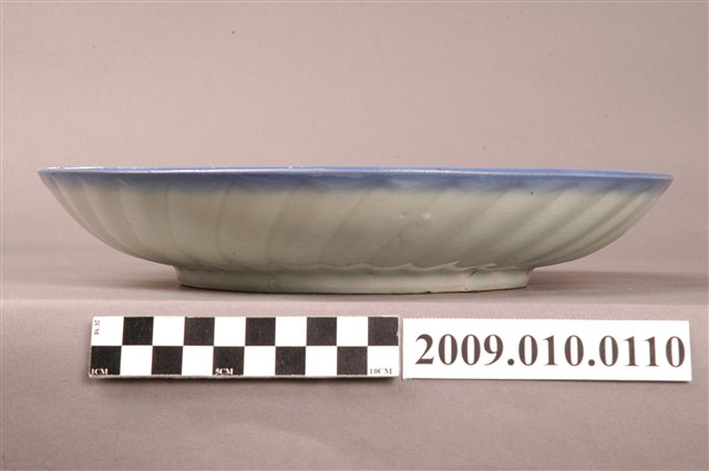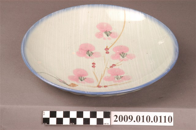 1.這件青瓷彩繪花卉紋圓盤,是北投地區產製的日用食具。圓唇,直口,弧壁下斂接圈足,圈足內可見鏇痕。通體施釉,以淡綠釉為地,釉面光澤瑩亮。在裝飾紋樣上,盤外壁無彩繪,但壓印旋紋裝飾;口沿處飾一圈青花弦紋,內壁淋繪白釉作幾何線條裝飾,上並以粉紅彩搭配紅釉及黃褐釉、綠釉繪花卉紋。2.臺灣北投、鶯歌等地區自產的花卉紋盤,常見以手繪方式繪花卉紋,並於口沿填繪青花弦紋一圈的裝飾方法。這些花卉紋飾以裝飾為目的,未必指涉具體花卉,因此形態也很多變。值得一提的是,約在日治時代後期至戰後初期,業者引進了氧化鉻作為色料,研發出粉紅色釉並裝飾於花卉紋上,掀起了裝飾上的流行。