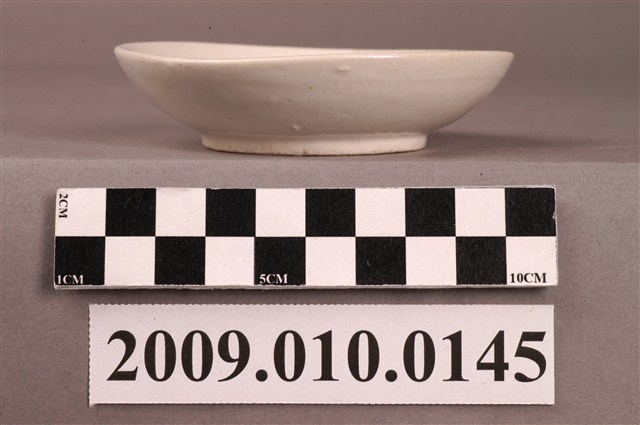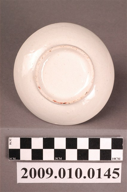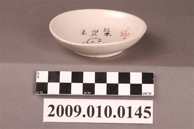 印繪彩釉人物紋圓盤圓唇,侈口,口沿歪斜,圓腹,弧壁下收至圈足,平底刮釉露胎,胎色較白,且胎質略微粗糙。全器施白釉,釉面光滑潤澤,釉色白皙,釉面略有氣孔以至於釉面並不平整。外壁素面無紋,紋飾主要繪於盤內。以黑、紅兩色釉轉印紋飾,黑色描邊勾勒出一人物形象,應是彌勒佛像,似是坐在一紅色果子中,又像是身裹紅色大袍。一旁以紅色釉繪一蜻蜓、蝴蝶般的昆蟲紋飾;人物上方草書五字:「法果自然生」。紋飾用色簡單,全憑筆觸線條變化配合書法展現裝飾的細節,構圖簡單,十分大方。