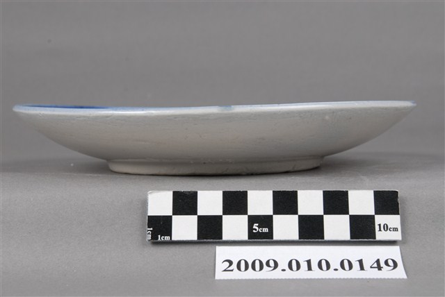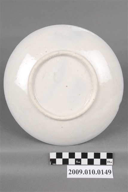 1.手繪彩釉鶴紋圓盤以覆鏇壓法製作,圓唇,敞口,口沿歪斜,淺圓腹,弧壁下收至圈足,低圈足,平底露胎,胎質細緻,胎色白皙。全器施以透明釉後入窯釉燒,再以釉上彩裝飾;器面多有雜質沈澱與些許氣孔,器表釉面不平整。盤外壁素面無紋,紋飾集中於盤面。口沿施罩一圈鈷藍釉,並在下方另繪一道弦紋裝飾,青花發色不均。盤中以鈷藍釉繪樹木枝幹,點綴上小花與草葉,再以墨色簡單繪單足立著的丹頂鶴紋。紋飾手法簡單,聚焦在鶴紋上,具有很好的裝飾效果。2.鶴紋帶有長生不老、長壽的吉祥涵義,由日本帶入臺灣而廣為流行,是日常用具中常使用的吉