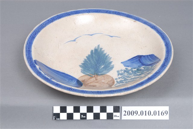 1.這件彩繪山水紋圓盤,是北投地區生產的日用陶瓷。折沿口,弧壁下斂,寬圈足,口沿壓印一圈回形紋,並塗一圈青花釉裝飾。圈足刮釉露胎,胎質厚重,胎色乳白。通體施釉,以乳白色釉為地,釉面開片現象明顯,盤面並手繪山水圖樣作裝飾。外壁素面無紋,僅圈足內壓印三道弦紋裝飾。內壁則手繪山水紋,以藍釉繪遠山及溪河、鳥群,褐釉繪樹幹和岩石,綠釉繪樹林、草叢,繪製筆法快速,風格率意。這種山水圖案裝飾帶有日本陶畫風格,但在北投技工的巧手繪製下,本件圓盤表現出不同面貌,頗有臺灣山林風景的味道。2.日治時代政府支持北投、南投、苗栗等地區的窯業生產,為臺灣陶瓷工業發展奠定了基礎。以北投窯業而言,如大正8年(1919)總督府補助設立「北投窯業株式會社」、昭和5年(1930)在中央研究所輔導下設立「台灣陶器株式會社」,促使臺灣能夠自行生產符合臺灣人飲食習慣的日用器皿。窯廠在二戰後仍持續發展,甚至聘請國外專家來開發、改良產品,直到1960年代後期,政府宣佈北投地區禁止開採陶土及燃燒生煤,北投窯業的地位才被鶯歌取代。
