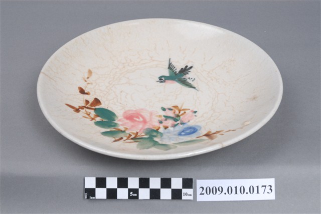 這件彩繪花鳥紋圓盤,為戰後初期北投地區產製的日用器皿。直口,淺弧壁,寬圈足,盤口略微歪斜。通體施釉,釉呈乳白色,釉面可見明顯開片現象。盤內以綠釉、黑釉及粉紅釉手繪展翅飛翔的小鳥圖案,小鳥旁以粉紅釉、褐釉、藍釉、綠釉繪薔薇花紋,繪彩筆跡俐落,色彩配置豐富。臺灣在戰後初期,頗為流行此類花鳥紋盤。其特色為以粉藍釉裝飾口緣,並在白釉為地的盤面上以粉紅色釉、綠釉彩繪花卉及在花間飛舞的小鳥。這種圖案裝飾生動可愛,獲得市場歡迎,因此也具有利於量產的標準化形制。本件圓盤雖未有藍釉邊飾,但構圖與花鳥紋盤一致,亦屬戰後初期同類作品。