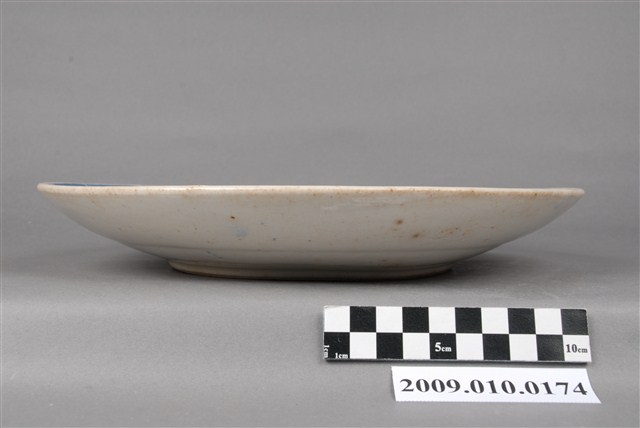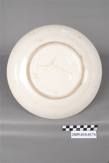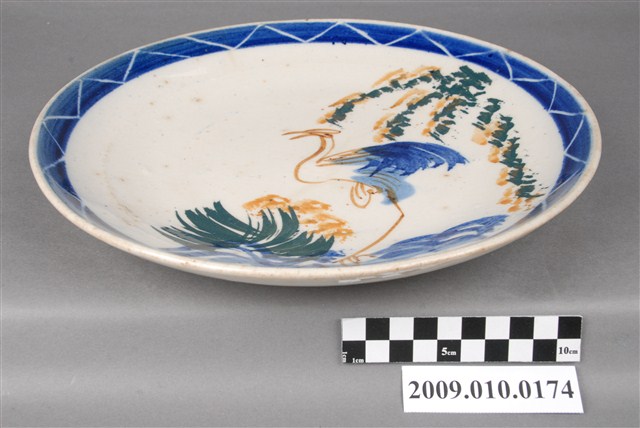 1.手繪彩釉鶴紋圓盤以覆鏇壓法製作,圓唇,敞口,口沿歪斜,淺圓腹,弧壁下收至圈足,低圈足,平底露胎,胎質細緻。全器施以透明釉後入窯釉燒,再以釉上彩裝飾;器面多有雜質沈澱與些許氣孔,器表釉面不平整。盤外壁素面無紋,紋飾集中於盤面。內壁近口緣處繪一圈鈷藍釉三角紋裝飾帶,青花發色濃重。盤中以鈷藍釉、黃釉、綠釉為主色調,繪垂掛而下的花草、土坡與花叢,再以同樣的釉色簡單繪單足立著的鶴紋。紋飾手法簡單,聚焦在鶴紋上,構圖別具新意,具有很好的裝飾效果。2.鶴紋帶有長生不老、長壽的吉祥涵義,由日本帶入臺灣而廣為流行,是