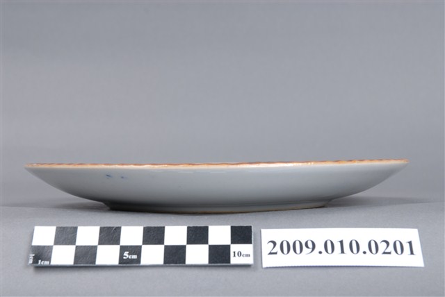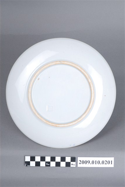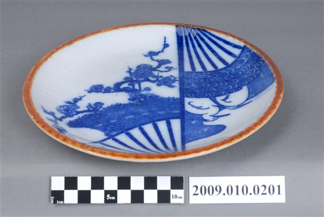 圓盤,主要用於宴會上盛裝菜肴。胎質細緻,瓷質。覆鏇壓法製作,平底,圓腹,圓唇,波紋狀折沿。低圈足,圈足內有一方形一「大德?」印款,但字跡模糊,從紋飾風格判斷,應是日本的製品。全器素燒後,以釉下彩青花轉寫技術裝飾,波狀的折沿上先畫上褐色寬邊線。器面以直線畫分為二比一的畫面,構圖上下反轉。每個畫面下方都飾有日本傳統的摺扇紋,小畫面有一對兩首相望似在對話的鷺鷥,以雲紋為背景。大畫面為兩棵枝幹曲折有勁的古梅,種在竹篾編成的蓆狀花盆上。這種把摺扇與動植物之類性質上本不相關的主題放同一畫面的設計,常見於幕末時期以來的有田燒器物上。畫面設計典雅,結構單純而不失活潑,具有日本傳統的繪畫風格,曾經大量輸出海外。