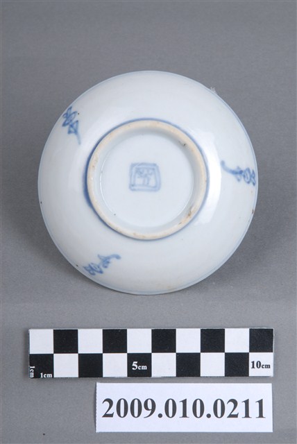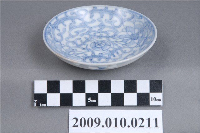 小圓碟,用於盛裝醬料。胎質細緻,屬於瓷質。轆轤拉坯法製作,平底,圓腹,圓唇,低圈足。全器以釉下彩繪裝飾,器底近圈足外部與口沿各畫有一道青花線,圈足內有正方形青花「芳」字款,為中國的產品,但產地與窯場不明。器壁外以青花寫上類似草書的文字,但無法識別。器體內部手繪由楕圓形、曲線與短直線構成的青花纏枝花卉紋,紋飾具有抽象性。畫工技術熟練,繪畫線條流輰,畫面十分繁密。
