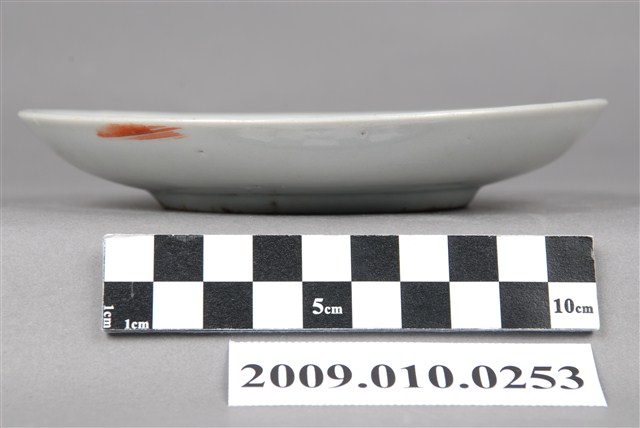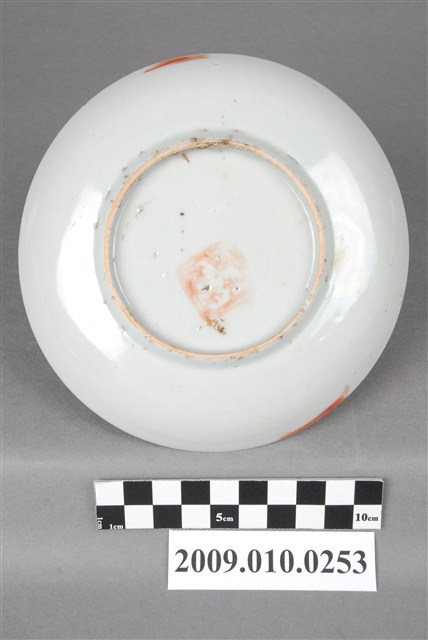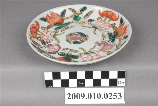 圓盤,用於裝盛菜肴。胎質細緻,瓷質。轆轤拉坏法製作,平底,深圓腹,圓唇,低圈足。全器以釉上彩繪裝飾,圈足內有紅釉方形文字款,但字跡模糊。中國江景德鎮製品,但窯場不明。器壁外畫有兩條橙色短線,主要紋飾在器壁內。先以褐色與橙色色料描繪輪廓,再加以填彩。畫面中心是粉紅色的花卉,周圍畫有幾片綠葉,以逆時針方向排列,成為視覺的焦點。主紋飾周圍畫有三組橘紅色蝙蝠紋,下方有兩個相交的古錢紋,綵帶飄動,具有吉祥的寓意。每個蝙蝠古錢紋之間加入一組花果紋,兩種花果以連枝結合,每組題材都不同,但無法確認究竟為何種花果。橙色、粉紅色與綠色主導畫面。畫工技法熟練,線條簡略,色彩鮮明而生動活潑,具有富貴華麗之感。