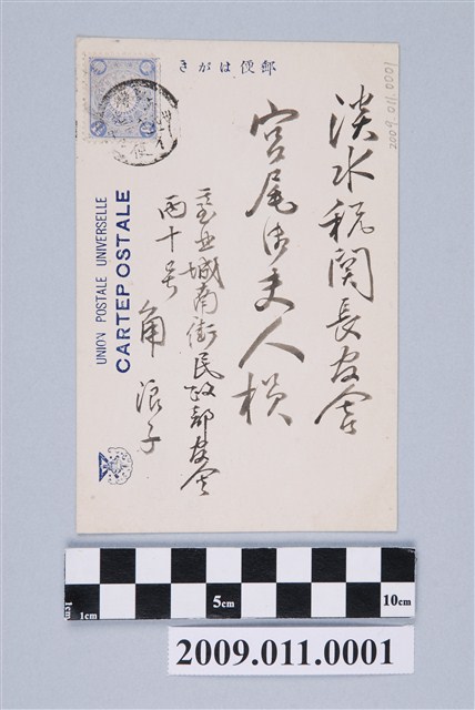 1.臺北城南街民政部官舍西十號的角浪(なみ)子寄給淡水稅關長宮尾舜治(生卒年1868-1937,1901/4/15至1906/4/14在任)的夫人宮尾豐子(とよ子)的明治39年賀年明信片(正面有書寫明治三十九年元旦字樣),該風景推測並非臺灣的風景。