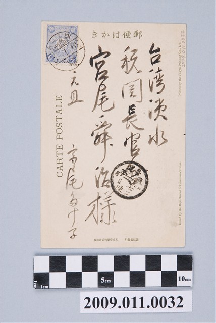 為宮尾?け子(推測為竹子)寫給淡水稅關長宮尾舜治(生卒年1868-1937,1901/4/15至1906/4/14在任)恭賀新年之明信片,該明信片除戰爭軍營風景(推測為日俄戰爭)外,還有雞、雞蛋、蠟燭、栗子、開栗子鉗子、魚封面罐頭及疑似印泥盒,意義不明。