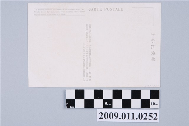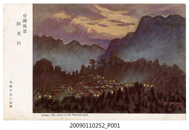 1.矢崎千代二於1937年以粉彩所畫國立公園「阿里山」,上印有落款「C. YAZAKI. 1937」,為矢崎氏所繪「臺灣風景」系列明信片之一。正面說明文字:「台灣風景、阿里山、Arisan; The centre of the National park.、矢崎千代二氏筆」,背面除印刷有「CARTE POSTALE、郵便はがき」外,以日文、英文二種語言介紹「In Tainan province, the centre of the forestry work. Mt. Niitaka is not far from here. The mountain train makes several rounds as the slope is so steep.」、「阿里山…海拔三○米の嘉義驛から、本邦唯一の登山鐵道で七時間、一舉に二二○○米を登つたところ。春は櫻、夏は避暑、秋は紅葉と遊客の絕えることがない。」(譯:從海拔30公尺的嘉義站,行經7小時,一舉登上2200公尺,是本國唯一的登山鐵道。春天賞櫻、夏天避暑、秋天有紅葉,遊客也源源不絕。)本件約為1937-1940年間發行。