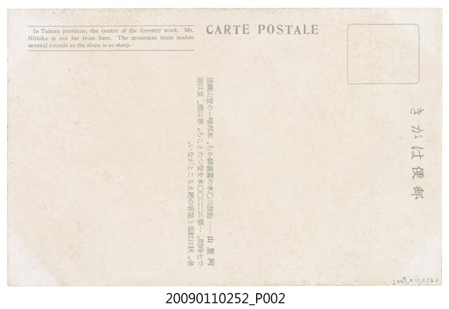 2.矢崎千代二(1872-1947)與石川欽一郎為同一輩畫家,擅長以粉彩速寫,捕捉旅行所見,昭和12(1937)年曾於臺北鐵道飯店舉辦過粉彩畫展,展出從北到南的臺灣名景,其中「日本旅行協會臺灣支部」精選其部分畫作,發行風景明信片。此張明信片描繪阿里山林場傍晚紅霞滿天、華燈初上的景色。