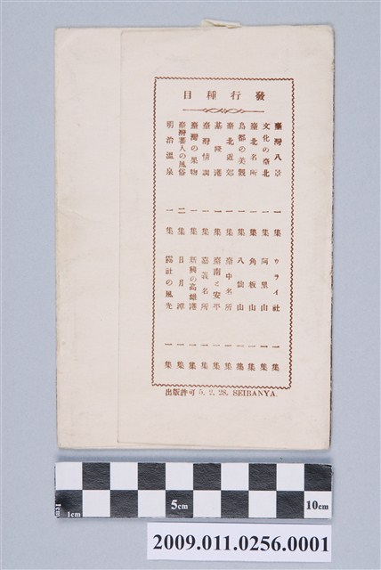 封面為臺灣總督府圖,特別標示為「高級天然色板」印刷。背面為發行目錄,最下方印有「出版許可5.2.28.」及「SEIBANYA」(譯:生蕃屋本店)等字。其中出版許可日期應為昭和5(1930)年2月28日左右。