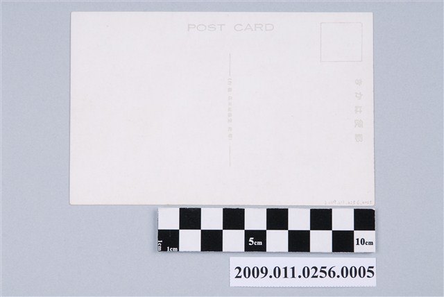 日本時代彩色印刷明信片,為「文化的臺北」明信片組系列之一,臺北生蕃屋本店發行。正面圖為建功神社正面照。左上角說明文字:「27 Kenko Jinja Taihoku.(臺北)建功神社:臺灣統治の犧牲者の英靈を祀る,鎮臺の當初より今日まで軍務公職に殪れ,たる一萬數千の英靈はとこしへに此處に鎮つて本島を護つて居ます。」(譯:建功神社,奉祀因統治臺灣而犧牲的英靈,包括從鎮臺之初到今日戰死的軍人及殉職的公職人員一萬多名,永祀在此守護本島)。背面印刷有「POST CARD,郵便はかき,臺北生蕃屋本店發行」等字。