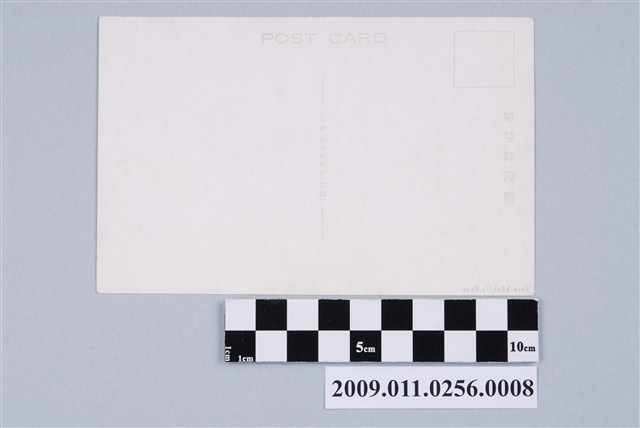 日本時代彩色印刷明信片,為「文化的臺北」明信片組系列之一,臺北生蕃屋本店發行。正面圖為新公園內的博物館(今國立臺灣博物館),右後方可見總督府官邸(臺北賓館)。右下角說明文字:「34 The Taihoku New Park and the Museum, Taihoku .(臺北)新公園 博物館:市の中央にある小ソンマリした公園,博物館は本島史料、蕃人に關する資料以外南洋方面の材料を蒐めて居る。」(譯:新公園博物館,位於市中心,有個小公園,博物館蒐藏與本島史料、蕃人、南洋方面相關的資料。)背面印刷有「POST CARD,郵便はかき,臺北生蕃屋本店發行」等字。