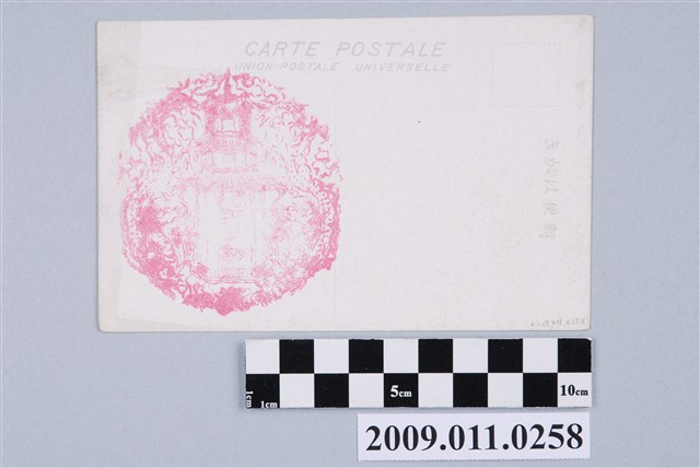黑白印刷明信片。圖為「臺南博物館」,原址為「兩廣會館」,門口右側掛有「教育博物館」館名牌。背面印刷有「CARTE POSTALE、郵便はがき」等字,並蓋有佛塔狀之紀念戳。本件約為1932-1940年間所發行。