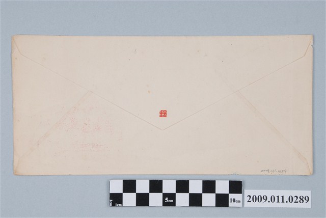 紅色肆角蔣公雙手交叉微笑郵票。郵票上蓋有3個圓形黑色郵戳,郵戳文字「台灣 四十五年十月卅一日十二 台中(甲)」。右下角區域另有一紅色方形印章「慶祝蔣公七秩華誕 萬壽無疆 台中 四十五年十月卅一日」及紫色彩帶形印章「發行首日 台中四十五‧十‧卅一‧」。信封背面中央印有一紅色「郵」字,其於空白。